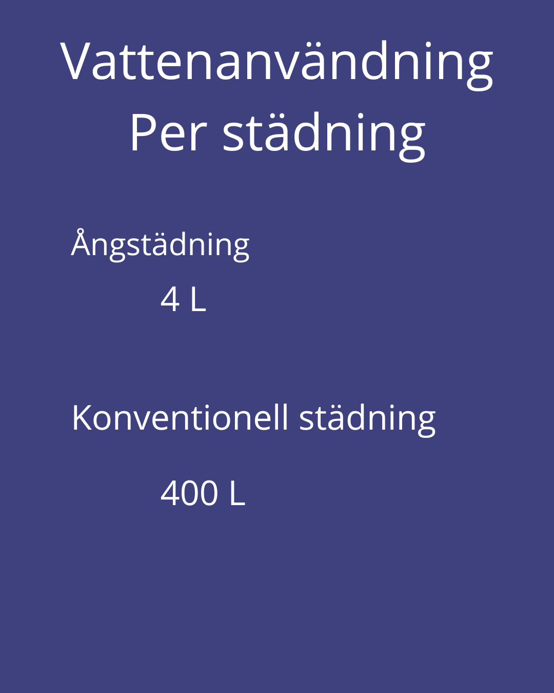 LiU genomförde även en analys för att jämföra vattenförbrukningen mellan konventionell städning och ångstädning under en flyttstädning. Resultaten avslöjade att konventionell städning krävde 400 liter vatten för att genomföra städningen, medan ångstädning endast använde 4 liter vatten för samma ändamål.